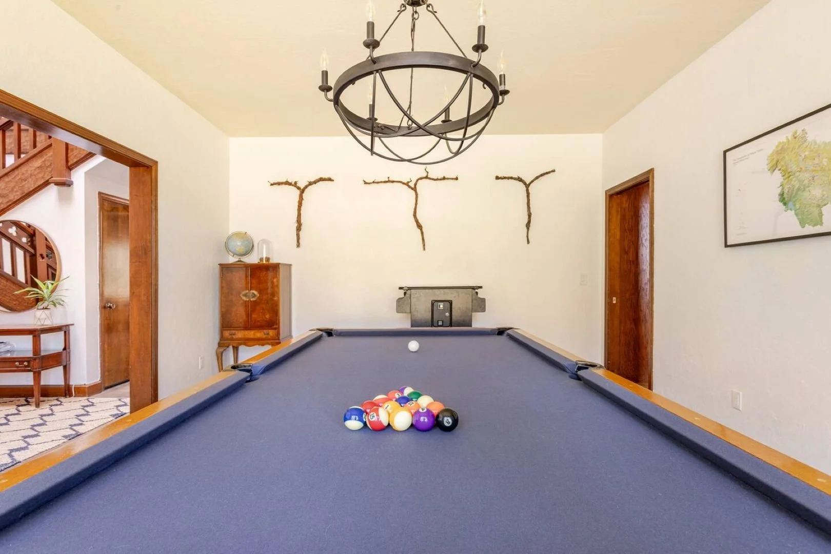 The secluded luxury estate home features 35-foot open beam ceilings, custom hand carved staircase, game room with pool table & arcade, home theater, chef grade kitchen, gym and deck with outdoor dining area.